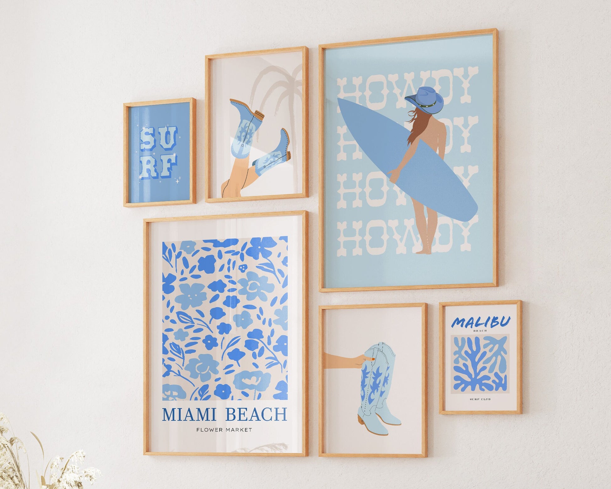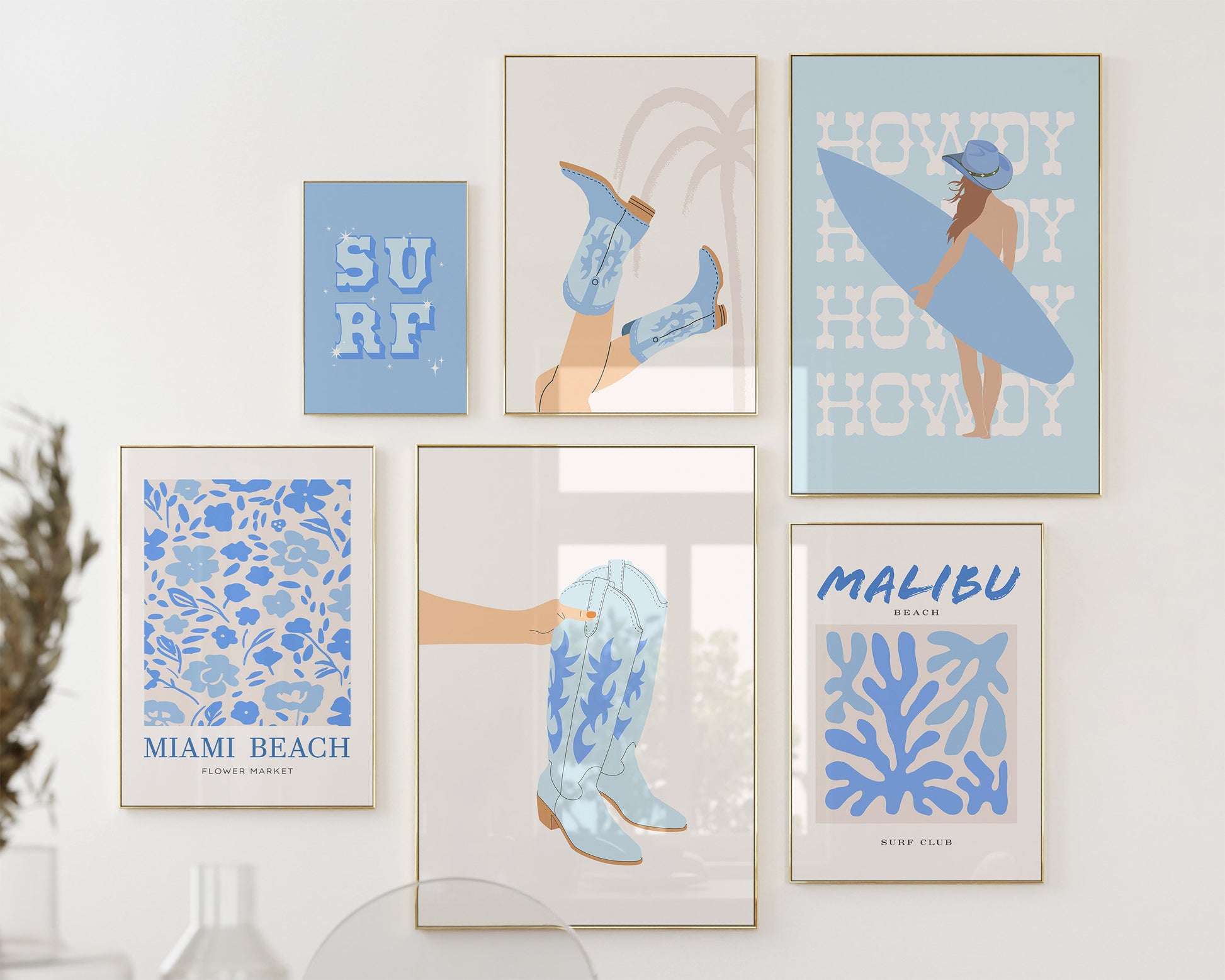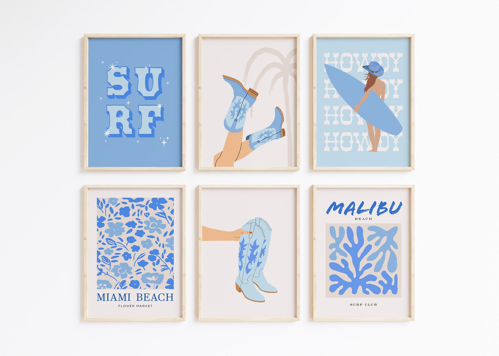 This collection features 6 stunning digital prints that seamlessly blend Western and surf vibes. The retro light blue color scheme adds a touch of the beach to any room, making it ideal for a trendy dorm room or preppy aesthetic. With a coastal feel that exudes relaxation, these prints will transport you to a beachside paradise. Versatile and stylish, these prints can complement any home decor style, whether it's boho, Southwest, or cowgirl inspired. Embrace the beauty of the beach with surf decor, coastal wall art, and trendy digital prints.