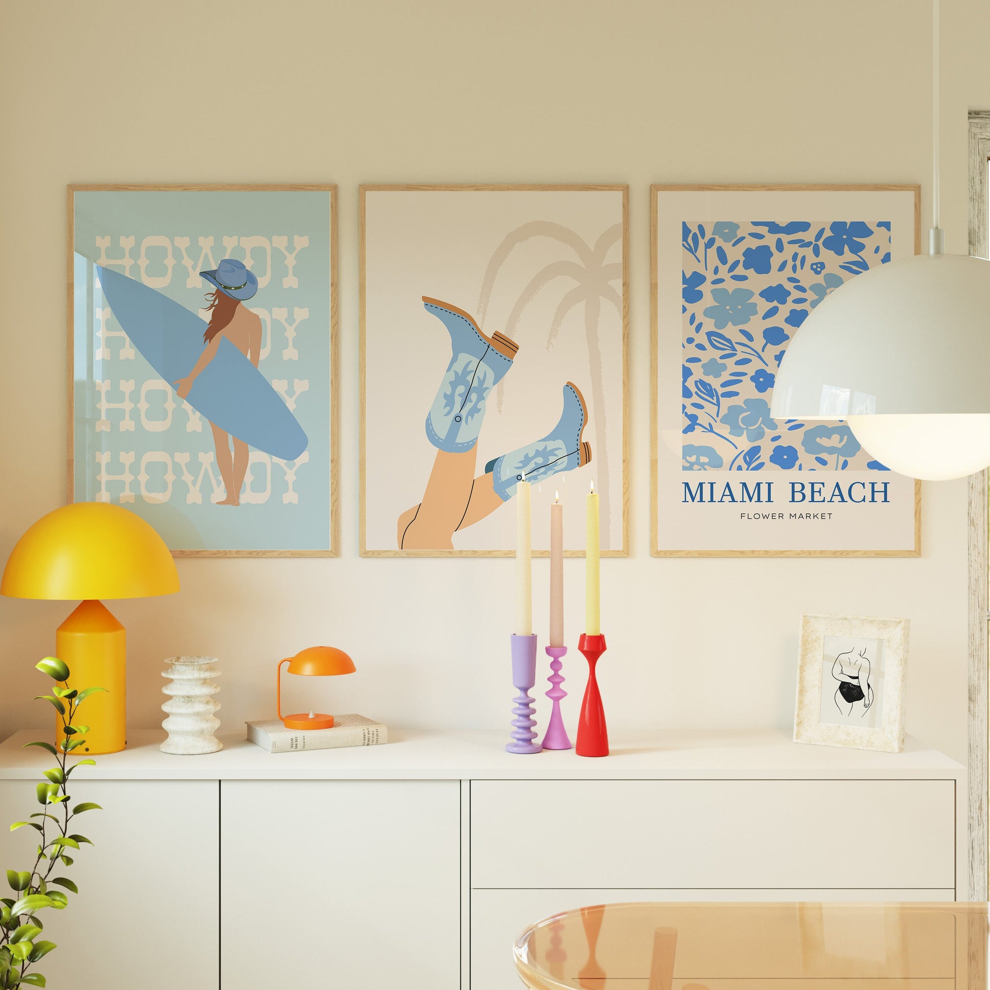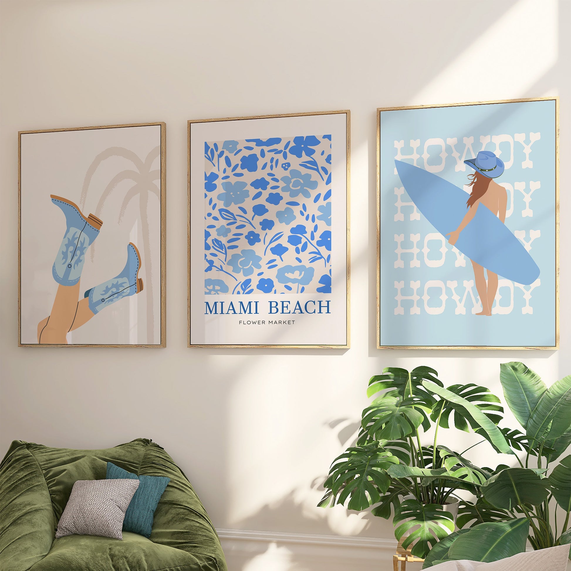 This set features 3 prints, including a surfer girl, flower market, and the phrase "Howdy," all designed in a trendy preppy style. The coastal theme brings a sense of relaxation and beachy inspiration to any room, making it perfect for those who love the surf and sand. Add a touch of coastal charm and personality to your home with our Blue Coastal Cowgirl set today!