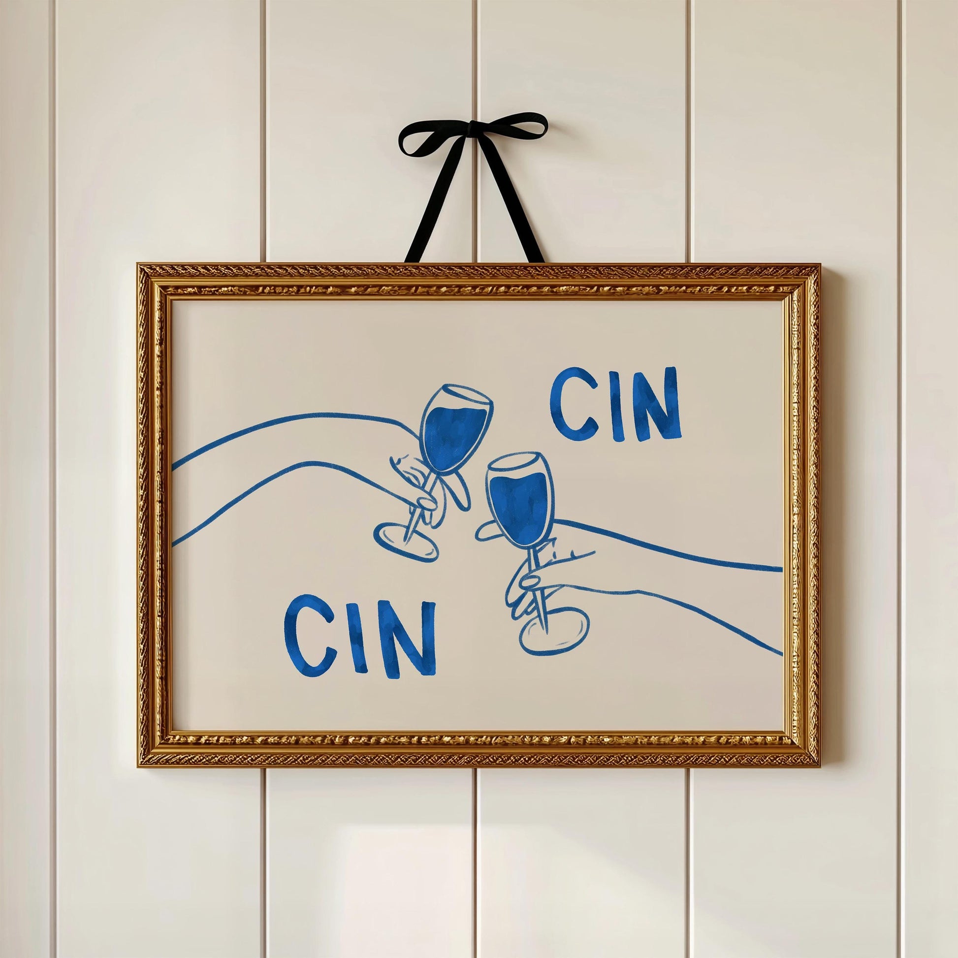 A minimalist blue line art print featuring two hands clinking wine glasses and the phrase “CIN CIN.” Ideal for a bar cart, kitchen, or entertaining space, it brings a fresh, celebratory touch to your decor.