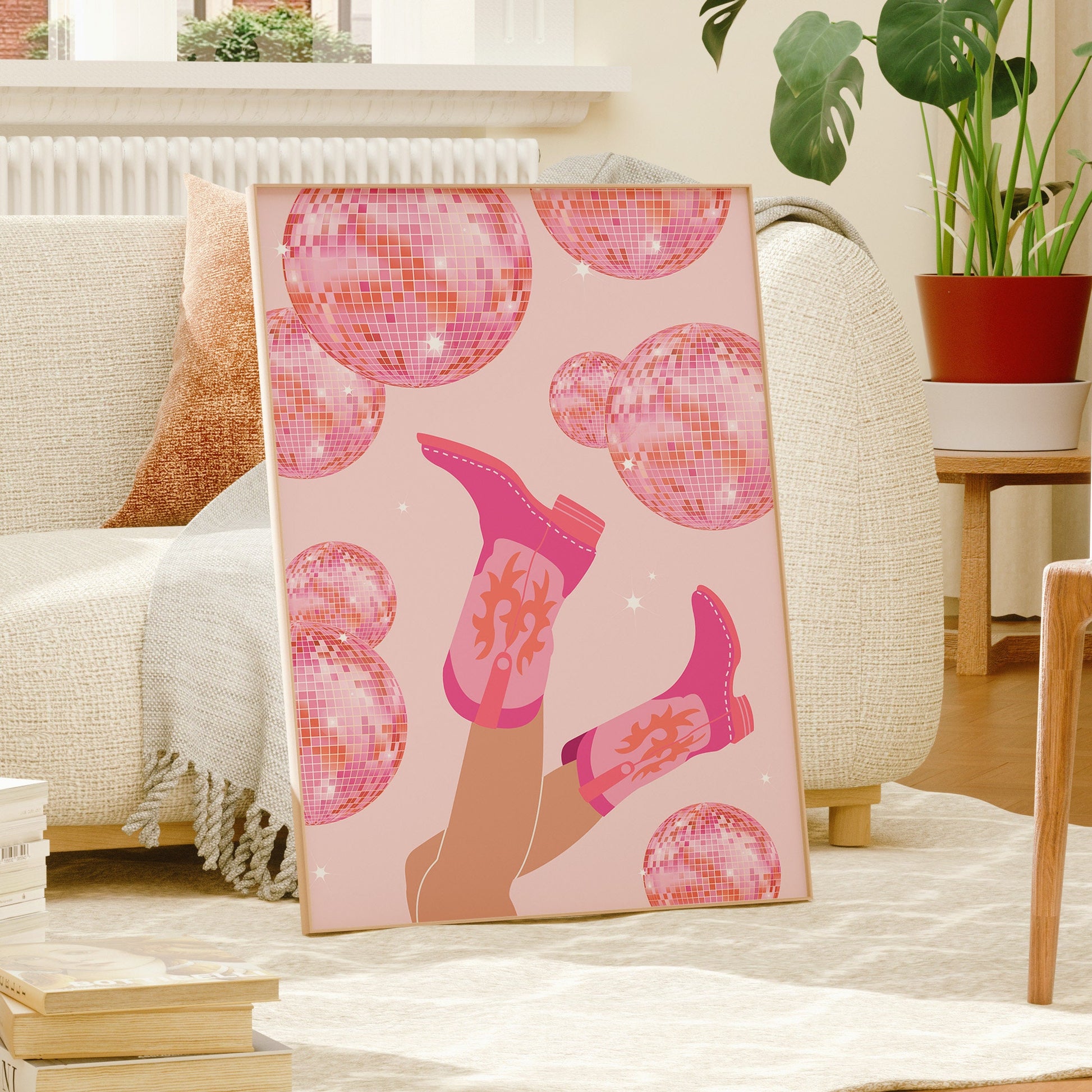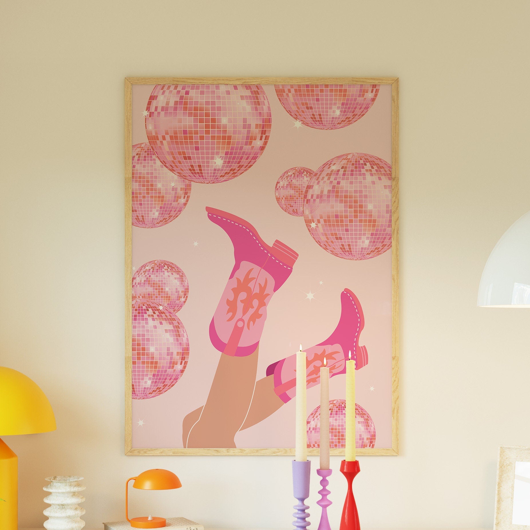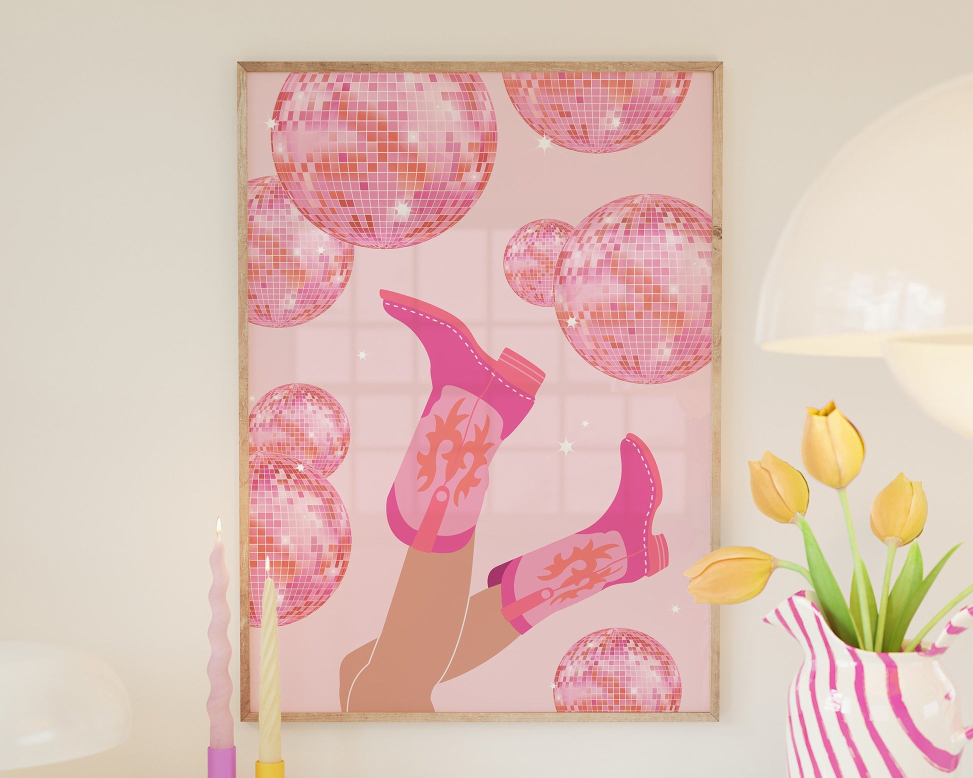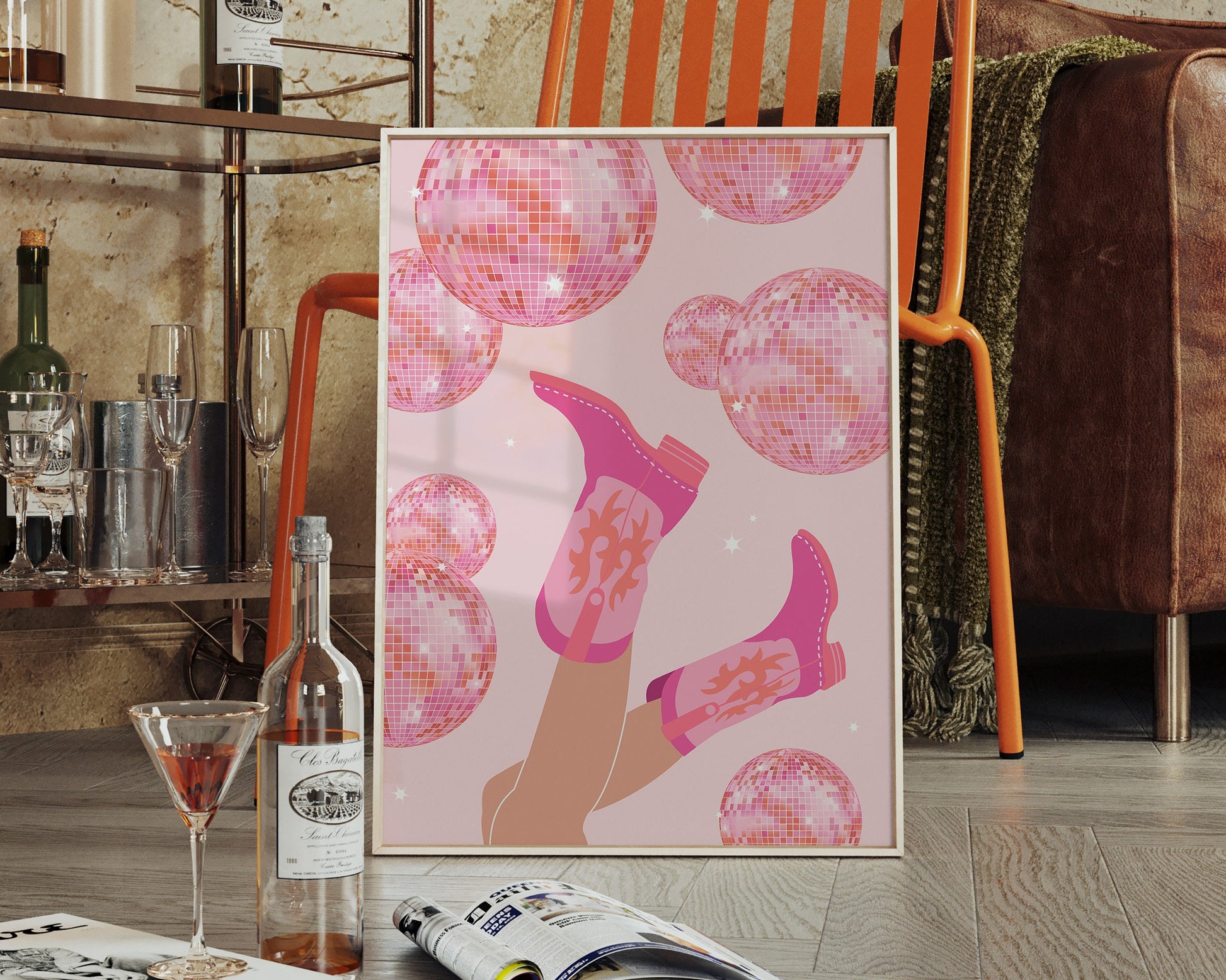This Cowgirl Boots and Disco Ball Poster is the perfect addition to any room. With its pink and orange color scheme, it will add a touch of western and preppy style. Whether you're decorating a dorm room or adding some flair to your bachelorette bar, this digital download is trendy and versatile. Featuring a disco ball and cowgirl boots, this print is a unique and eye-catching piece of wall art. Add a touch of disco and country charm to your space with this printable artwork.