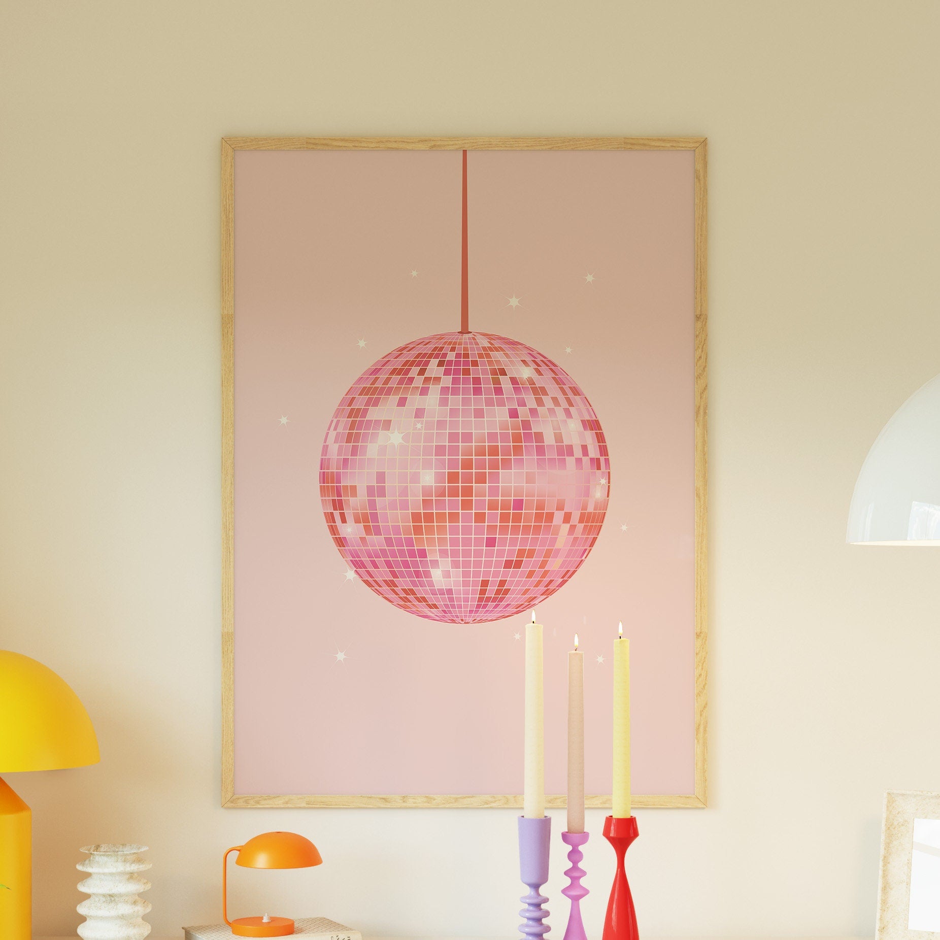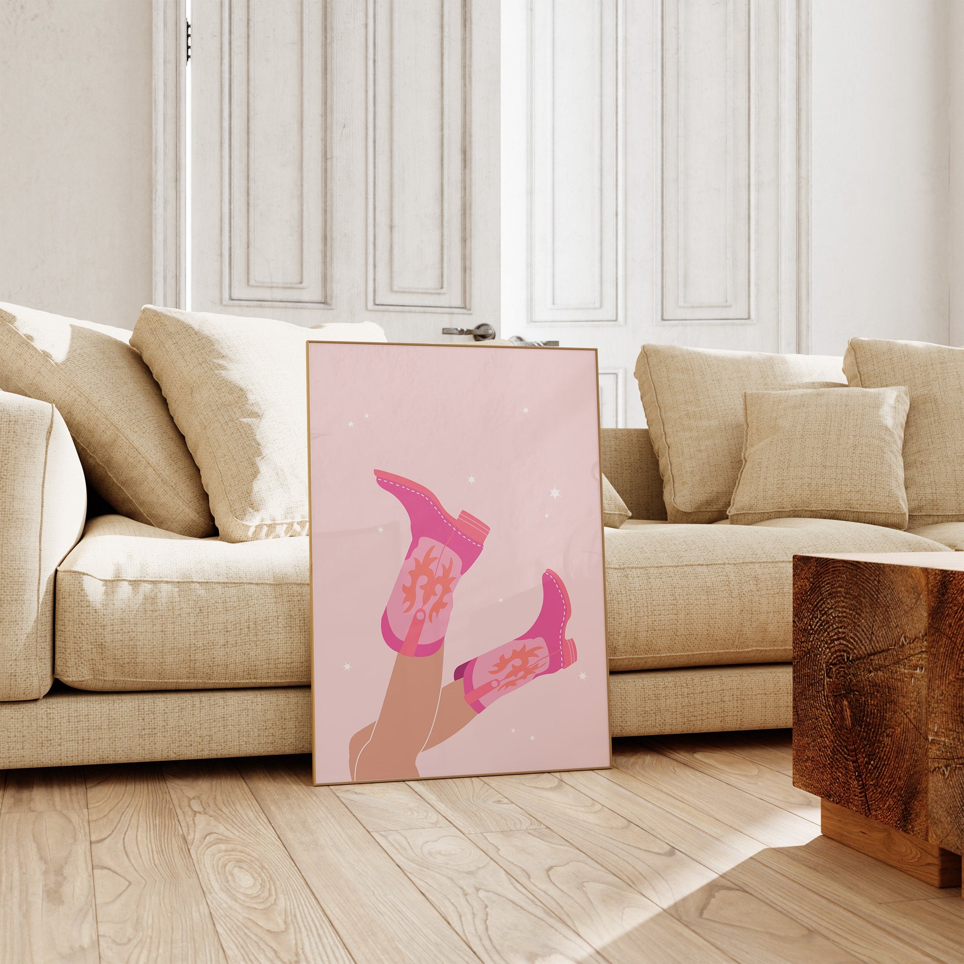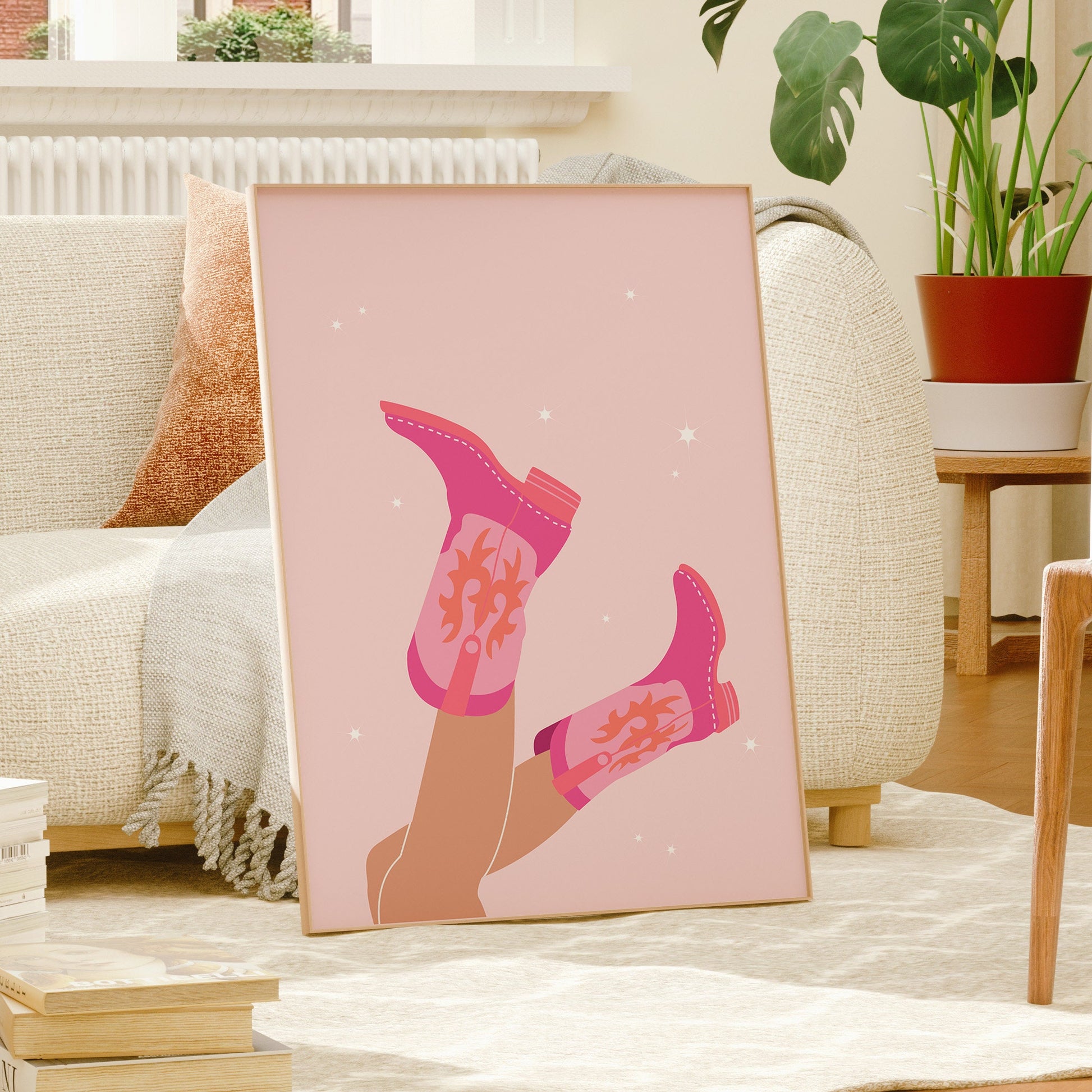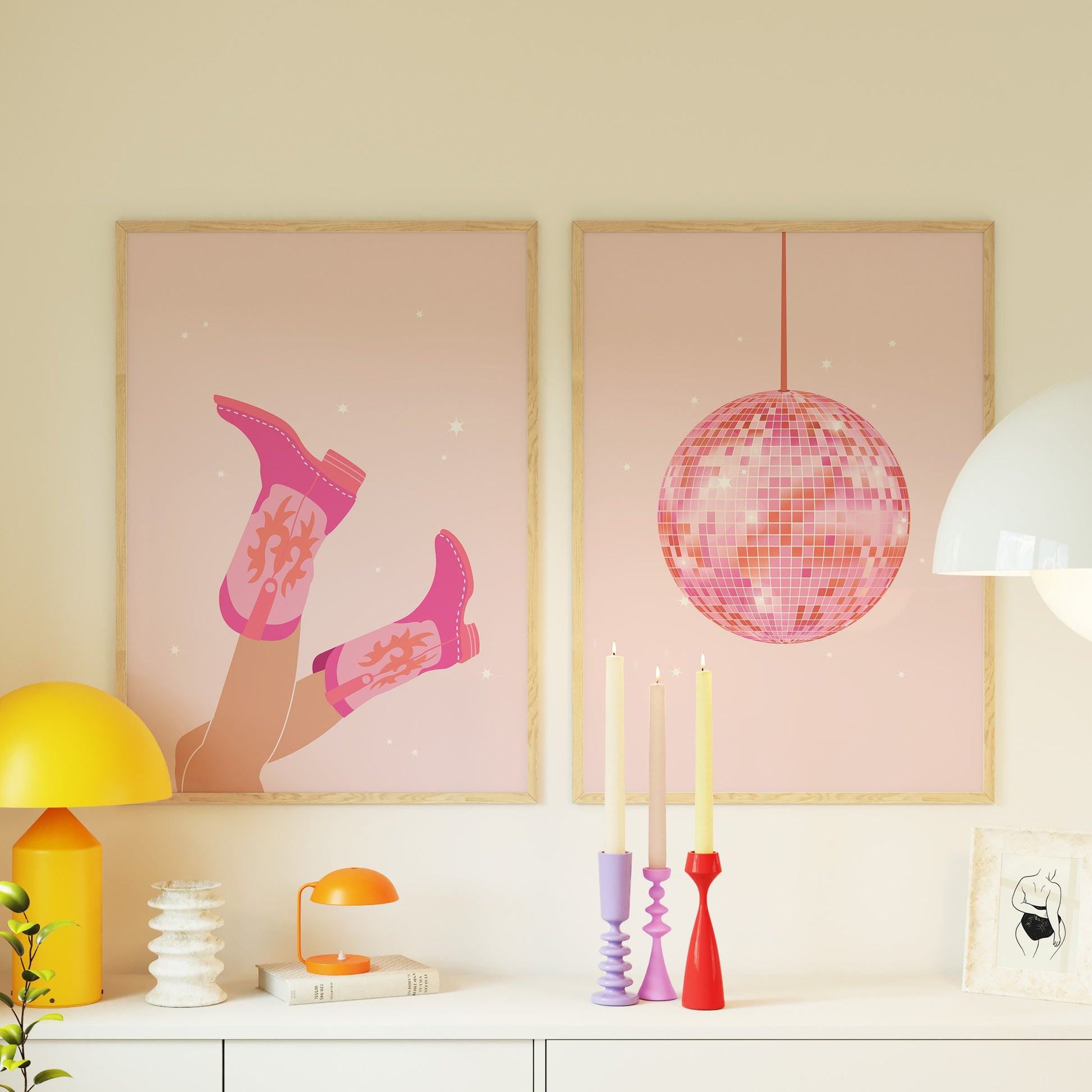 Enhance your dorm room with a touch of disco and western flair with the Cowgirl Boots Disco Set - featuring two vibrant prints, for that preppy aesthetic. This trendy set includes Cowgirl Boots and Disco Ball prints. Elevate your bar cart or wall decor with this Western Art Print, showcasing the perfect blend of pink and orange hues. Perfect for any cowgirl or disco lover, this collection adds a pop of color and style to any room.