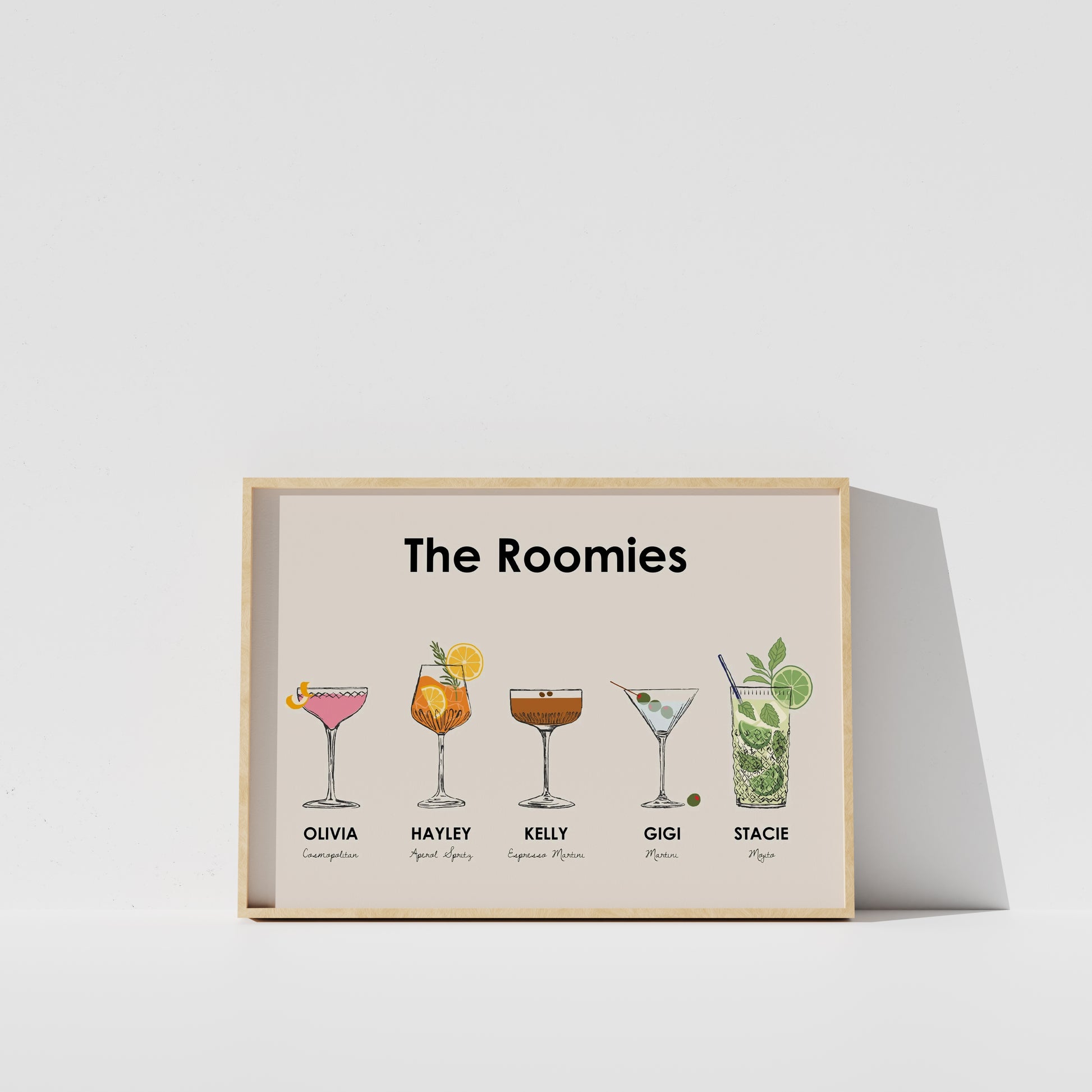 The Roommate Drink Print for 5 is a custom cocktail wall art designed to elevate your dorm room decor while celebrating friendship and fun. Perfect for college students, this personalized drink art showcases five favorite cocktails, making it an ideal custom roommate gift that adds personality to any college bar cart print or apartment bar decoration.