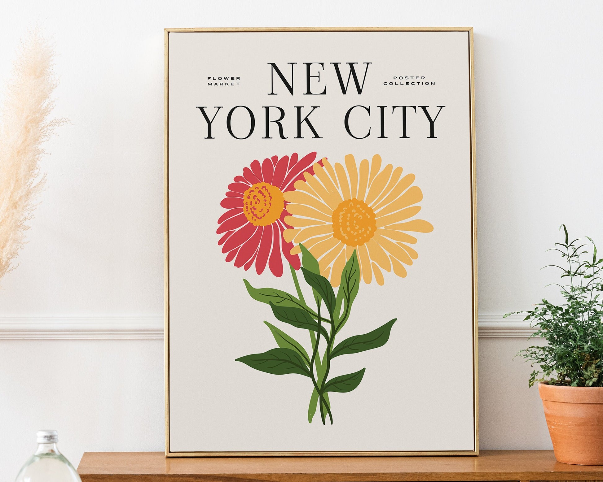 This print features the Flower Market in New York City, showcasing a vivid and colorful selection of flowers.