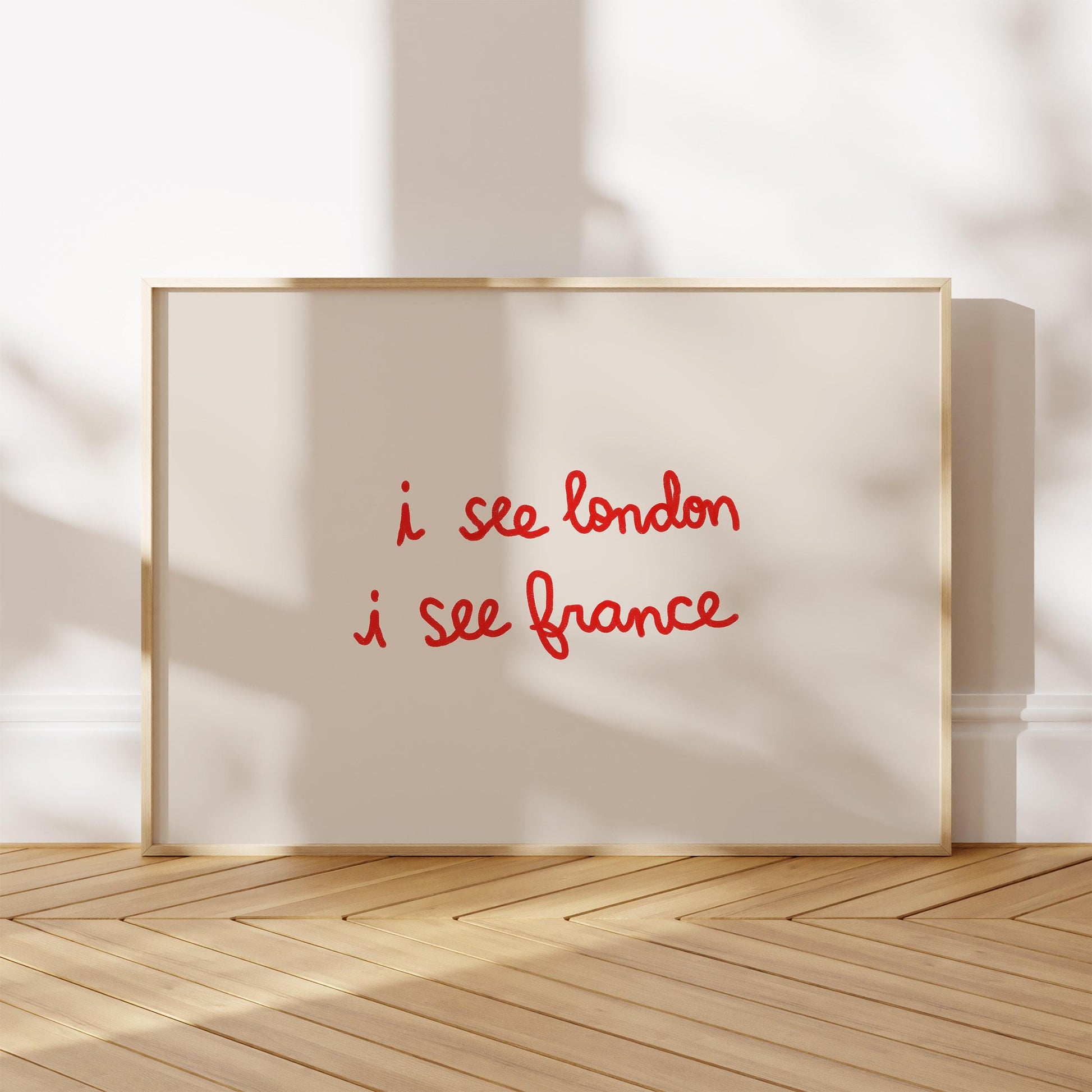 A minimalist hand-lettered design featuring the phrase “I see London i see france” in bold red script. The clean layout and warm red tones make it a fun accent for bedrooms, living rooms, or eclectic wall decor.
