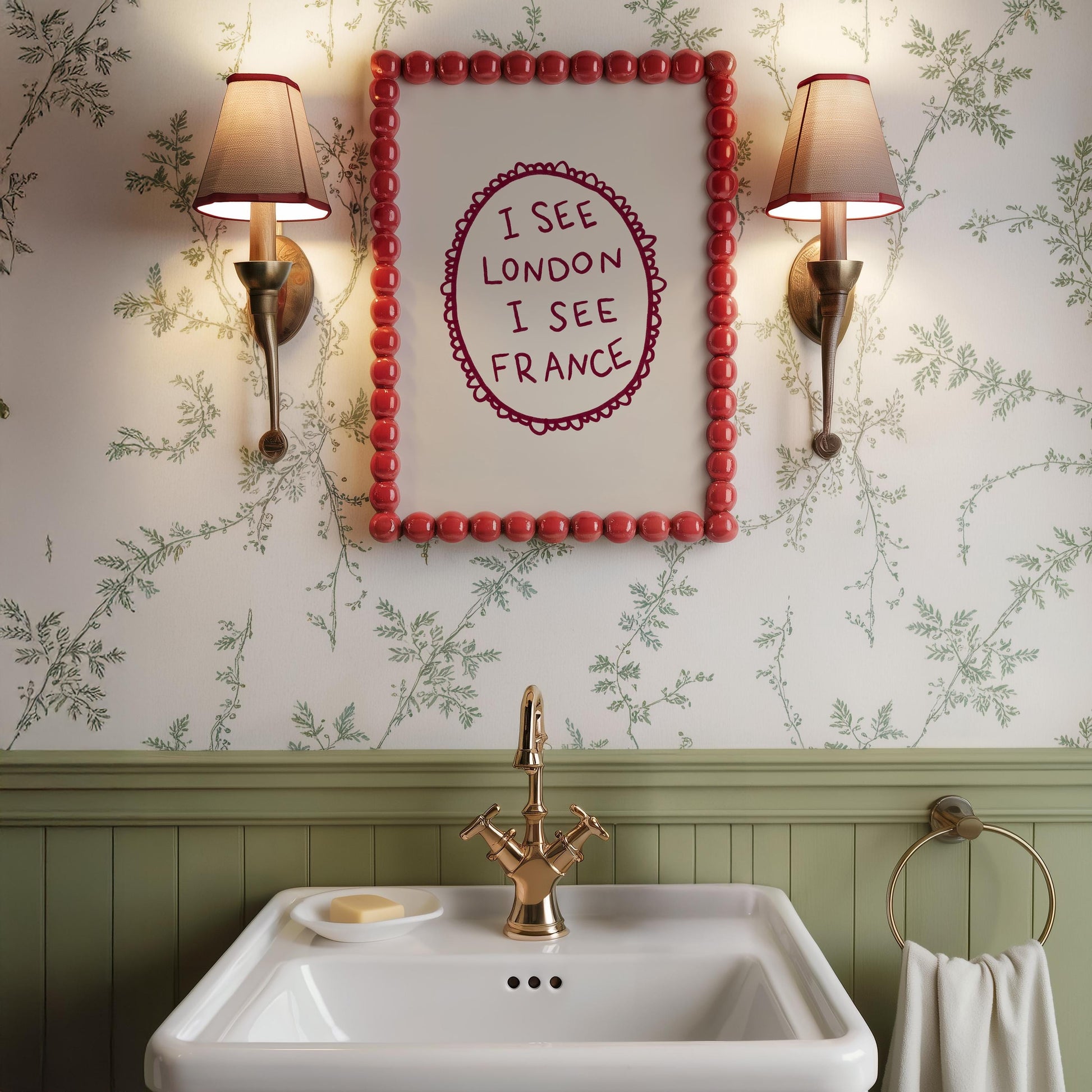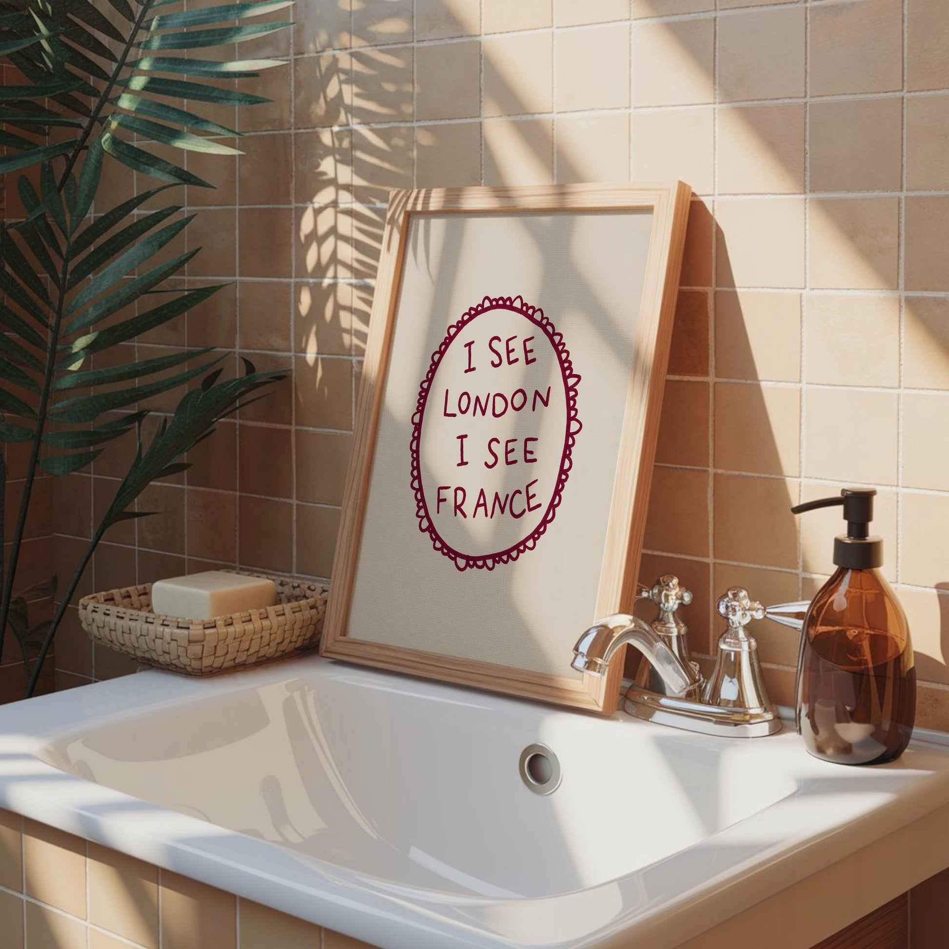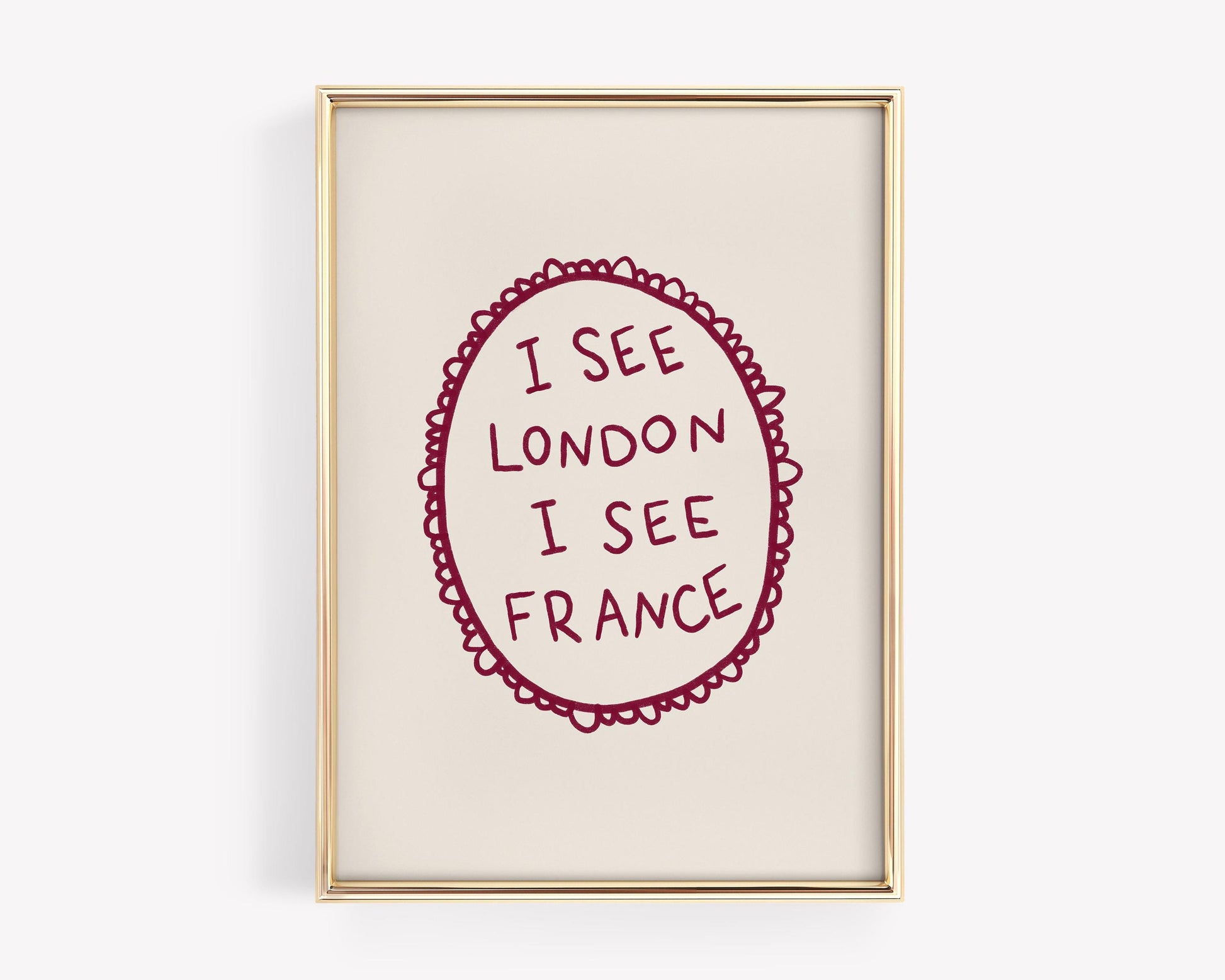 A minimalist burgundy typography art print framed by a hand-drawn oval border and featuring the phrase “I see London I see France.” Ideal for a bedroom or playful gallery wall, it adds a whimsical, nostalgic accent.