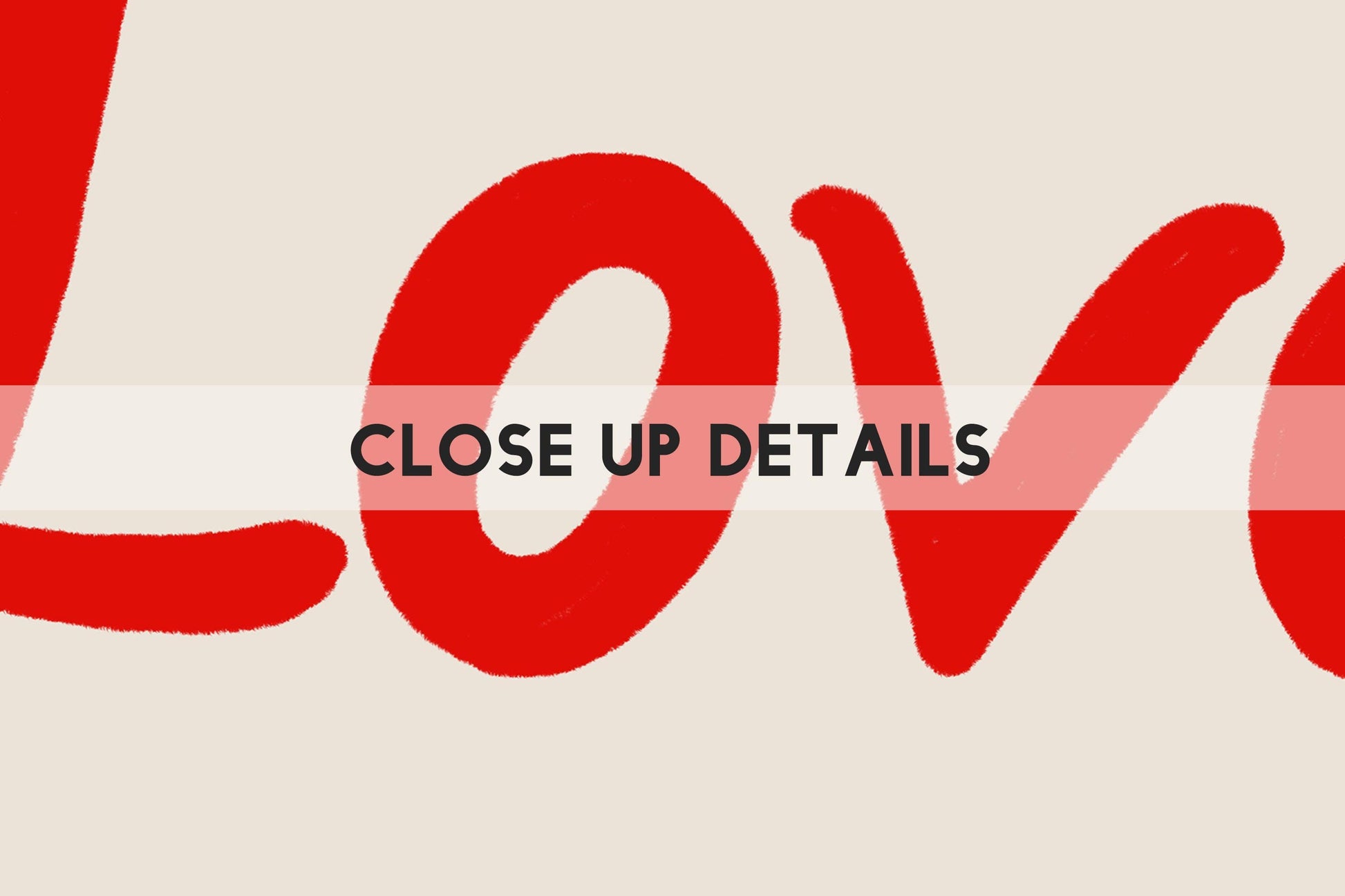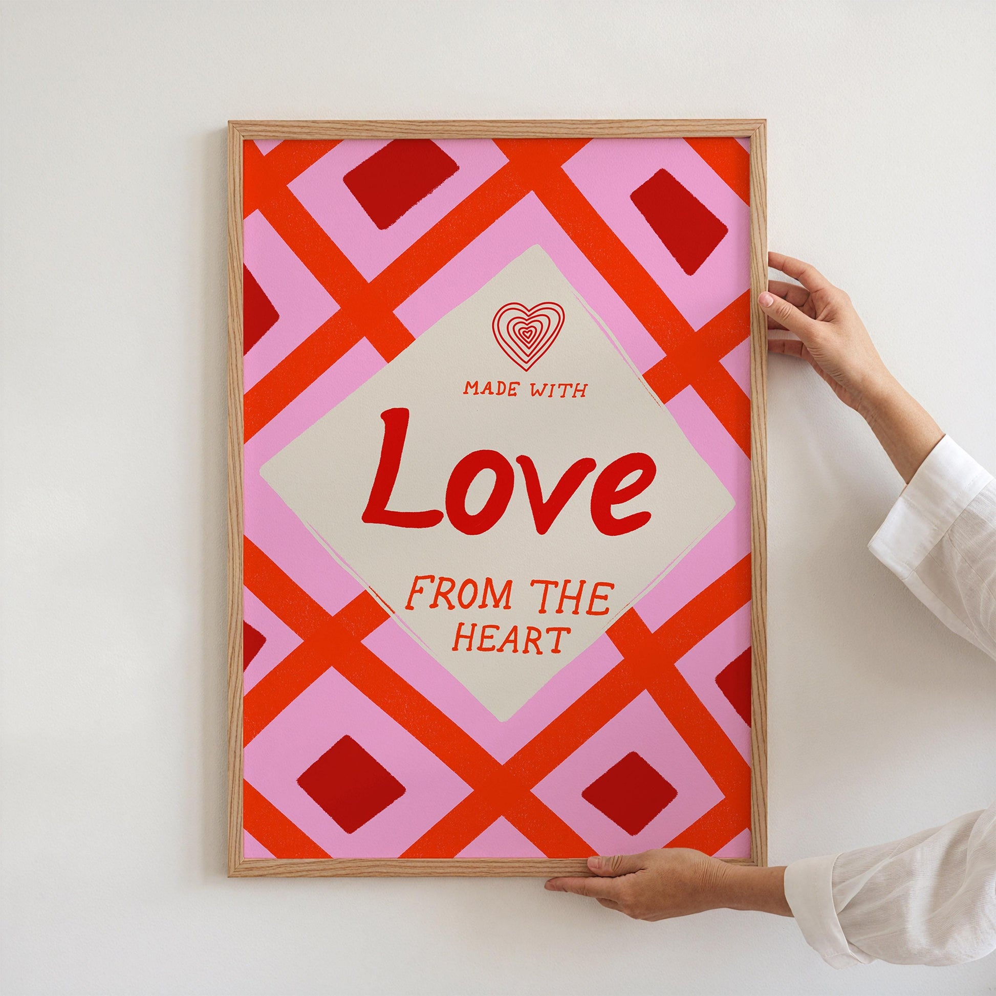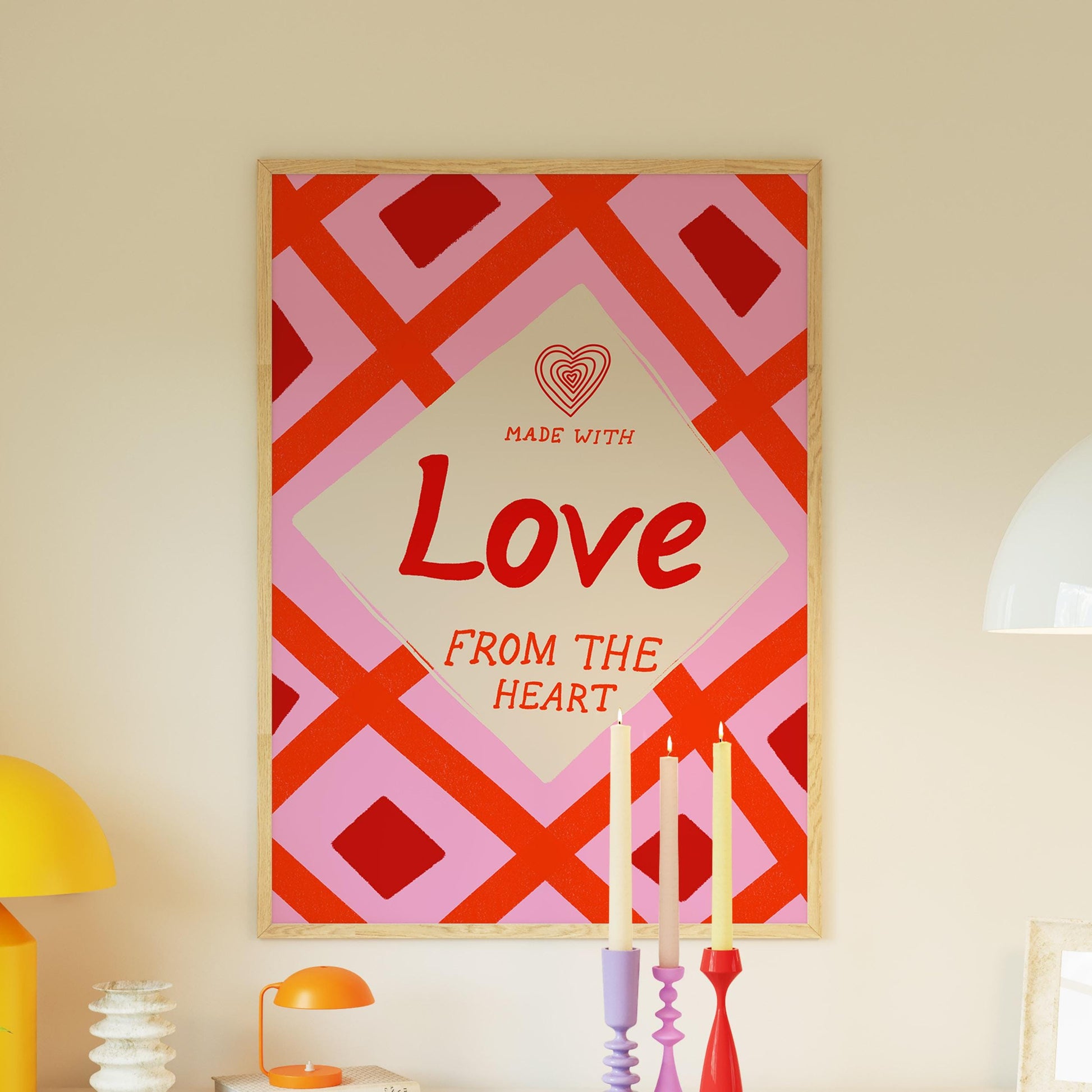 A bold red and pink graphic art print inspired by vintage packaging design and featuring the phrase “Made with Love from the Heart.” Perfect for a kitchen or dining space, it adds a playful, retro statement to your decor.