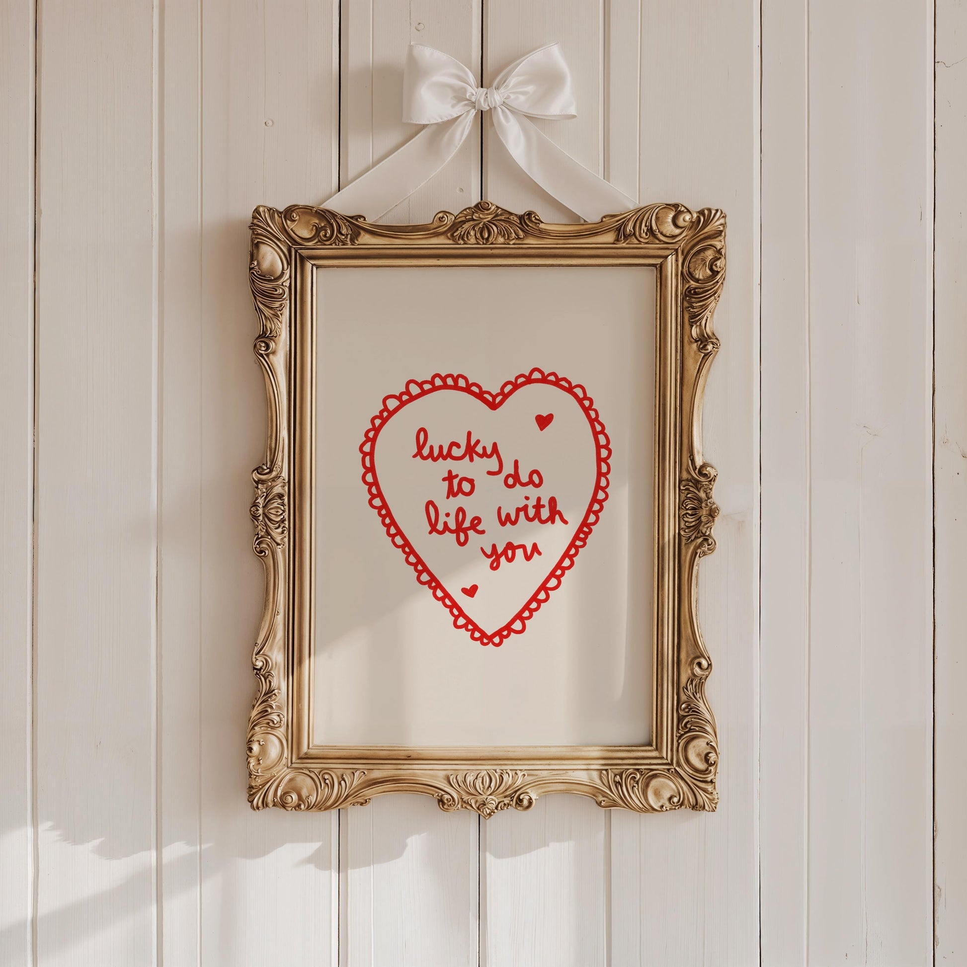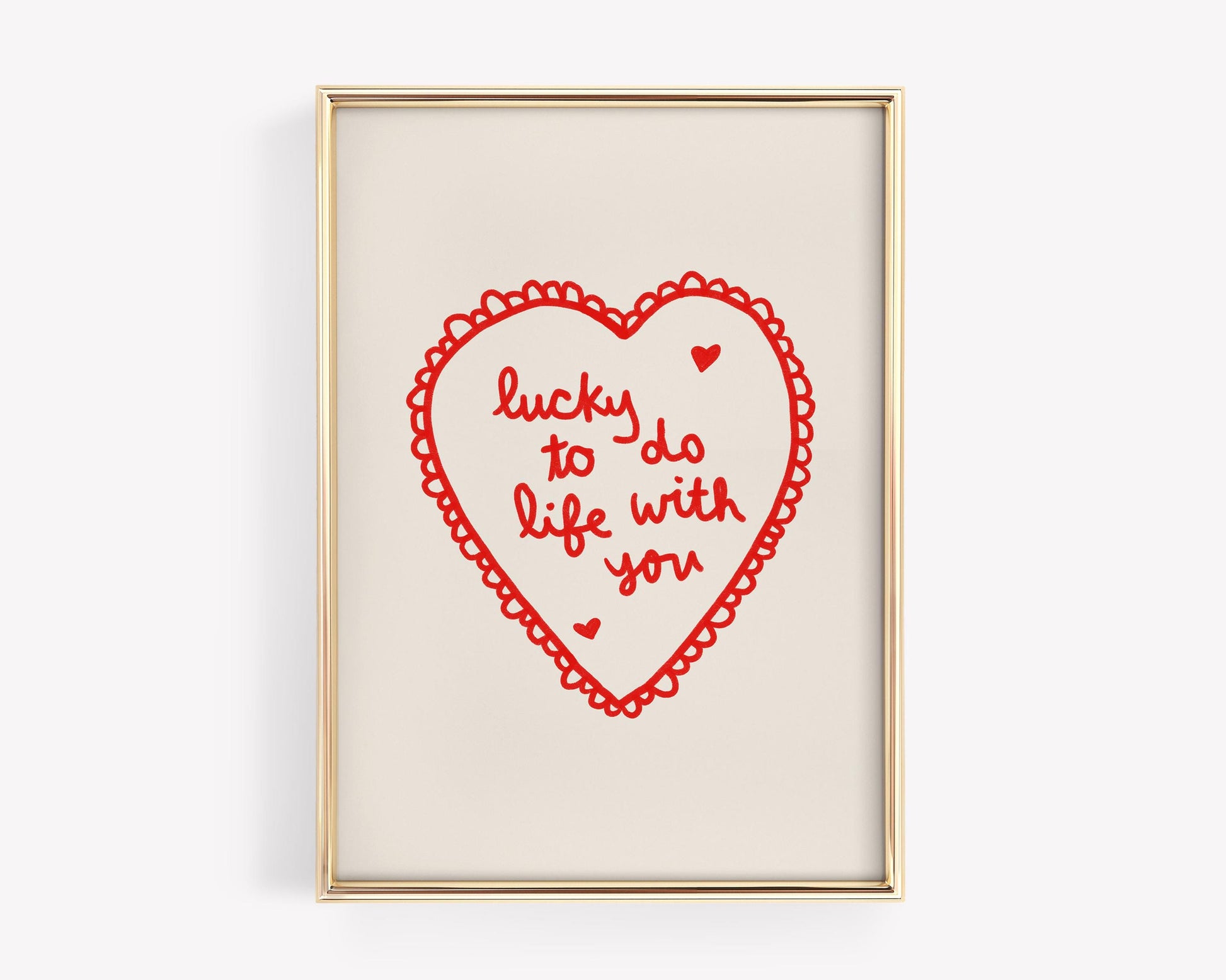 "Lucky to do life with you" love wall art is a heartfelt art print that adds warmth and personality to any space. This romantic wall decor features a bold red heart and a playful handwritten quote, creating an inviting and cozy vibe perfect for bedrooms or living areas. Its timeless charm enhances sentimental home decor while expressing meaningful connection through stylish wall art.