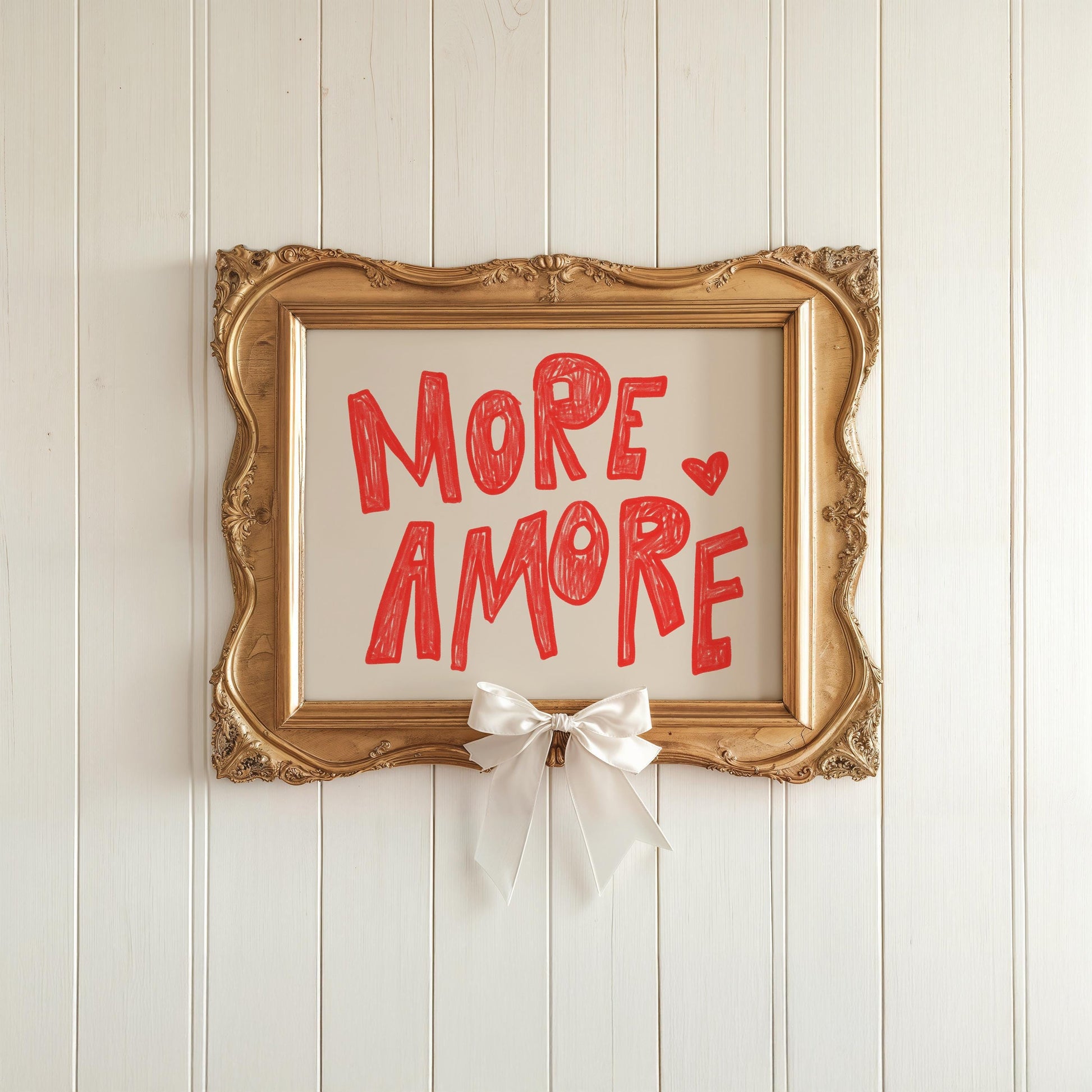 A bold red hand-drawn typography art print featuring the phrase “MORE AMORE.” Perfect for a bedroom, living room, or bar cart area, it adds a fun, expressive statement to your decor.