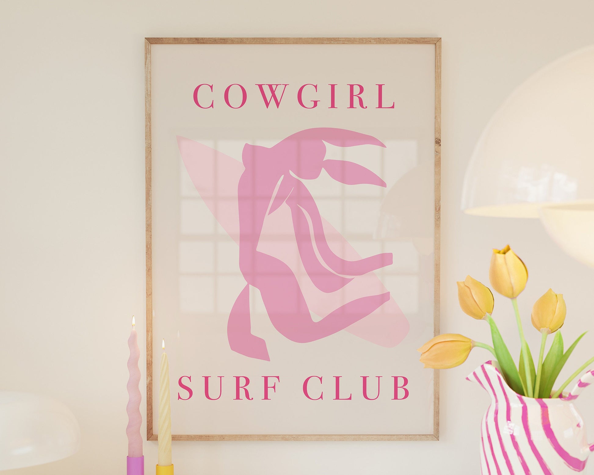 Display your love for the coastal cowgirl lifestyle with this set of 12 preppy and trendy wall art prints. Featuring a variety of themes such as cocktail bars, surf beaches, and disco balls, these prints will add a touch of retro charm to any dorm room or living space.