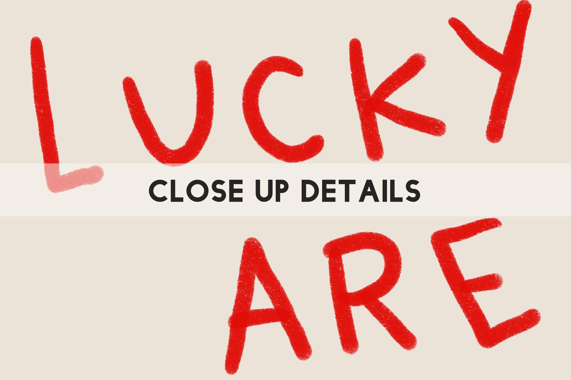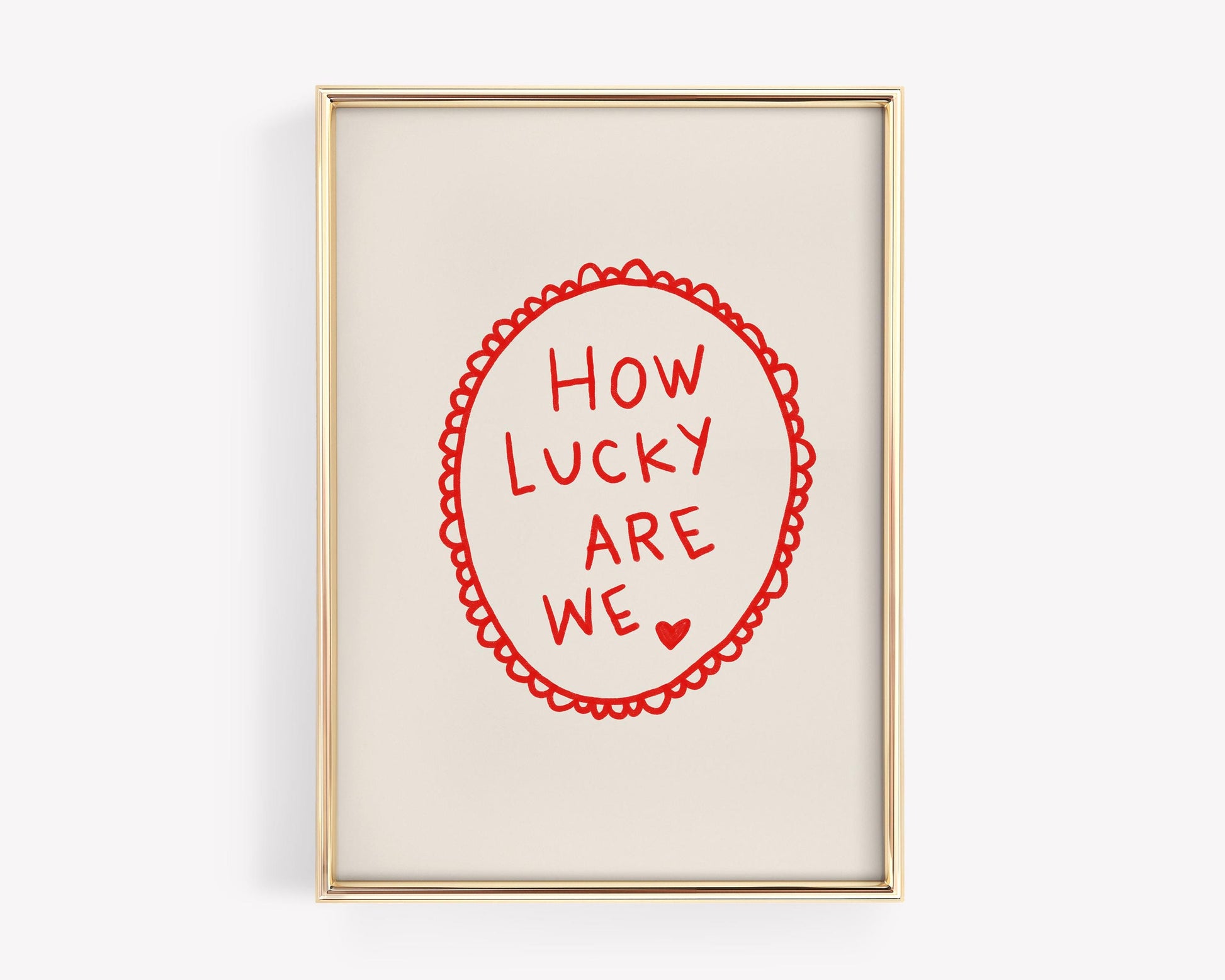 A hand-drawn lace-style oval frame featuring the phrase “how lucky are we.” The bold red-on-cream color palette gives this design a soft, vintage-inspired feel that fits bedrooms, living rooms, or romantic wall decor.