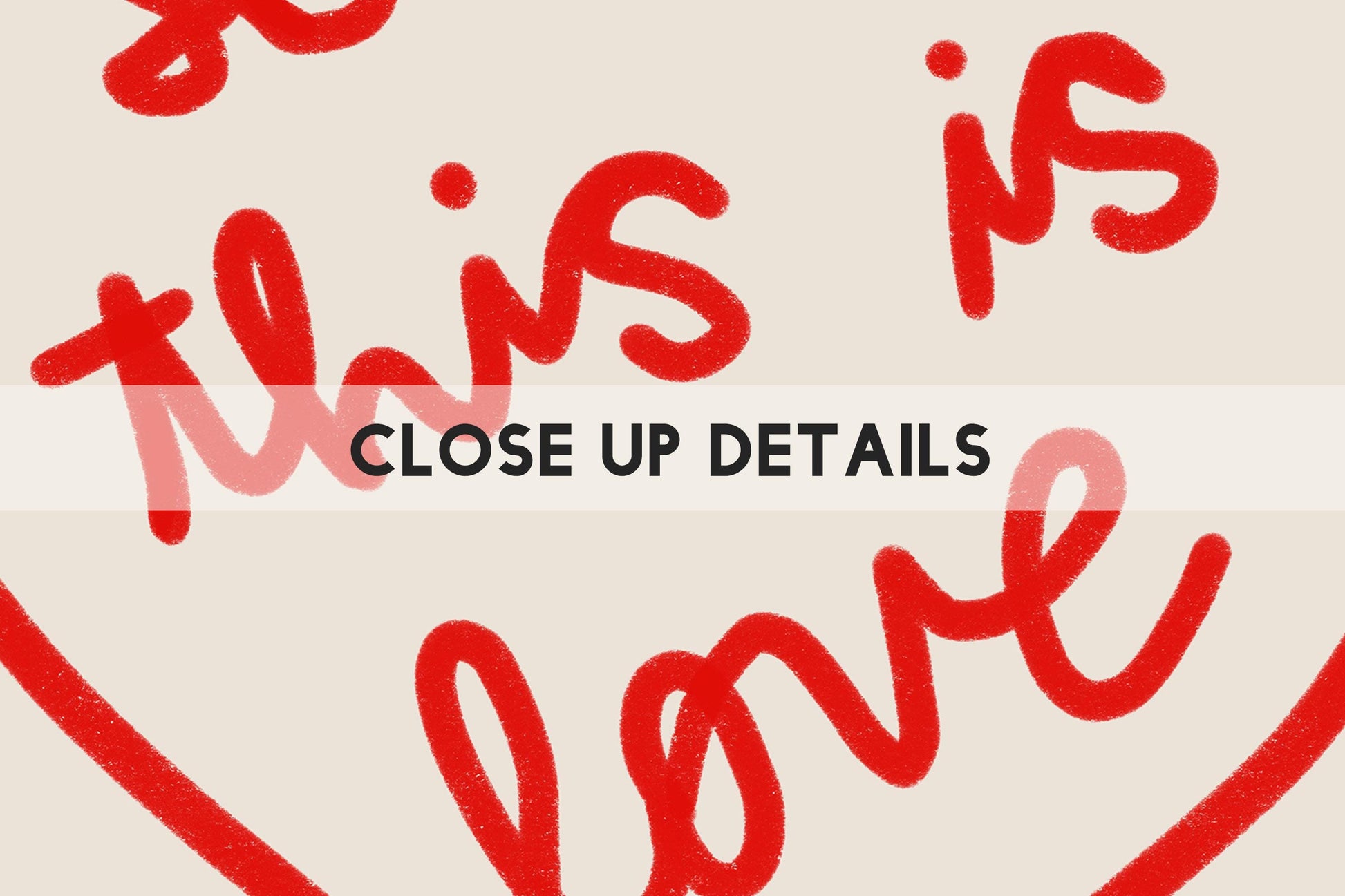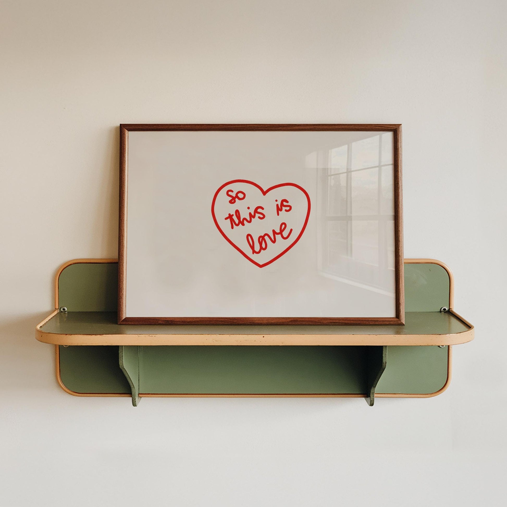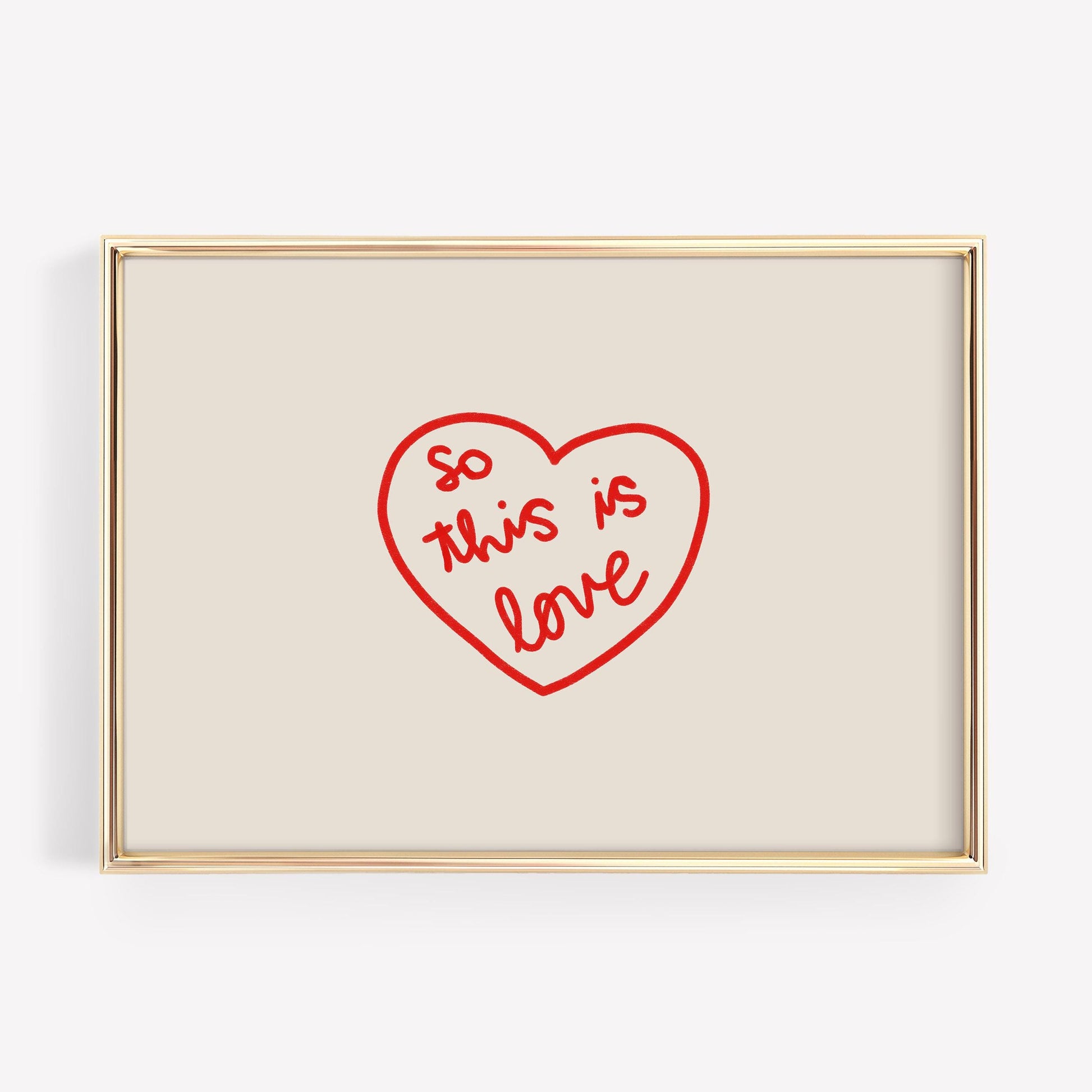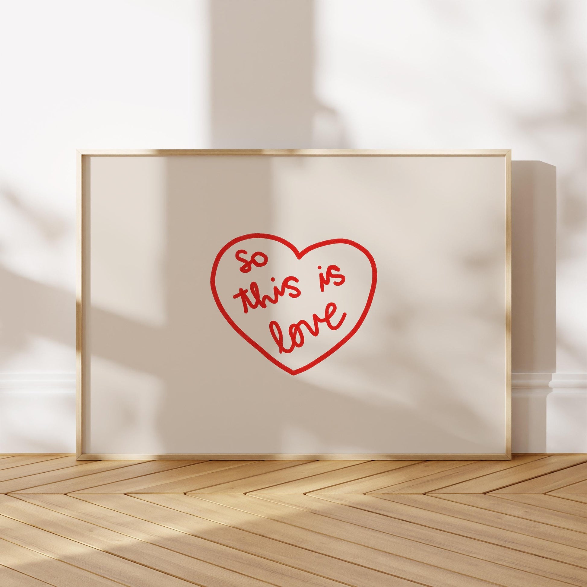 A hand-drawn red heart design featuring the phrase “so this is love.” The bold red linework on a soft neutral background creates a playful, romantic look that works beautifully in bedrooms, living rooms, or gallery walls.