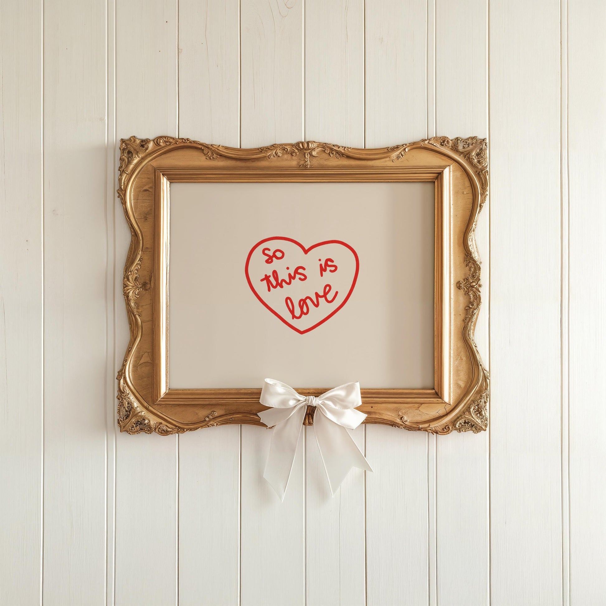 This romantic wall art features the handwritten love quote "So this is love" paired with a vibrant red heart artwork on a warm beige background, creating a cozy bedroom art piece perfect for adding sentimental home decor to your space. Its modern romantic decor style blends effortlessly with bedroom wall decor, gallery wall art, or cozy living rooms. Ideal as an anniversary gift art or for anyone who appreciates typography wall print with a soft, heartfelt vibe. This digital art print brings a trendy yet timeless feel that enhances any room with warmth and charm.