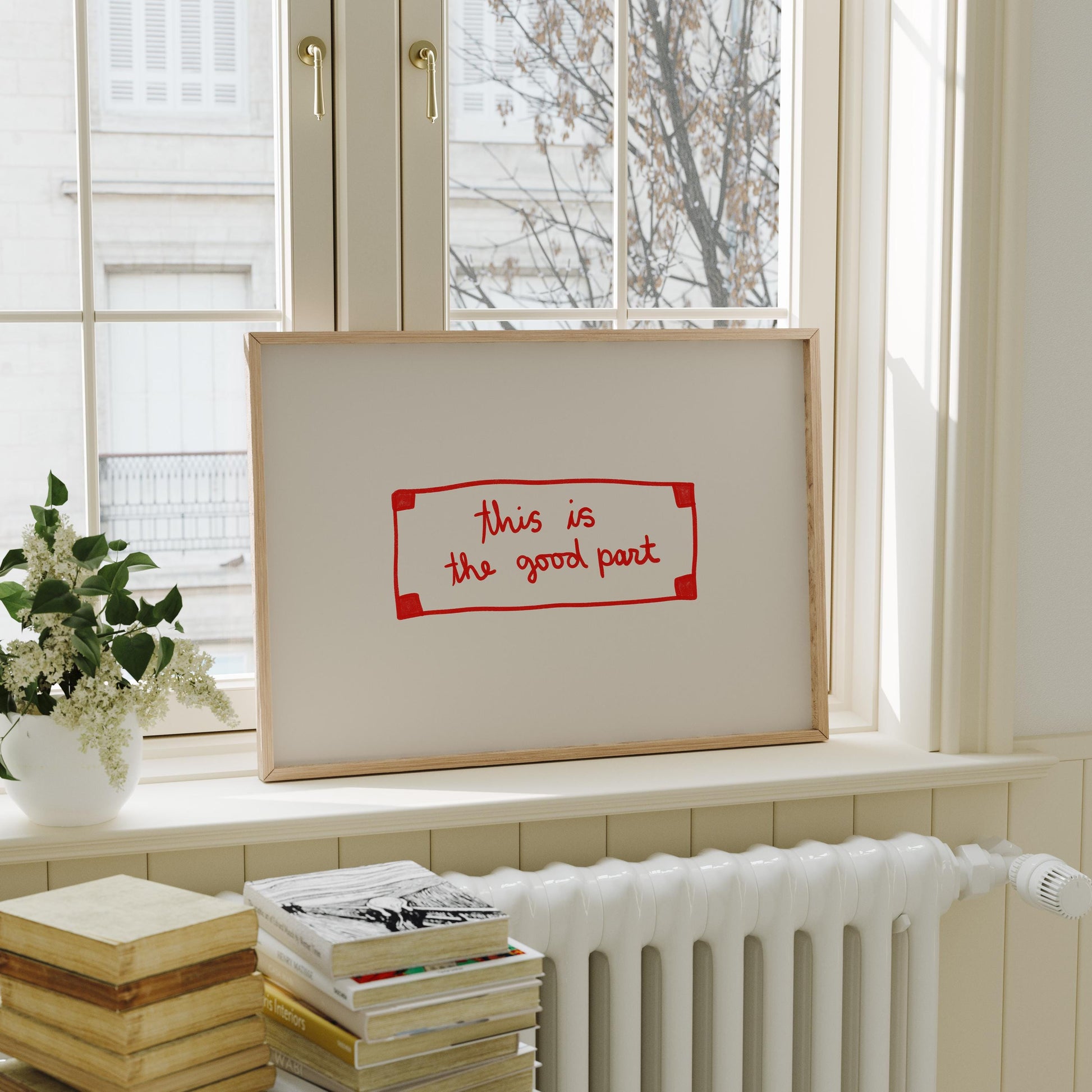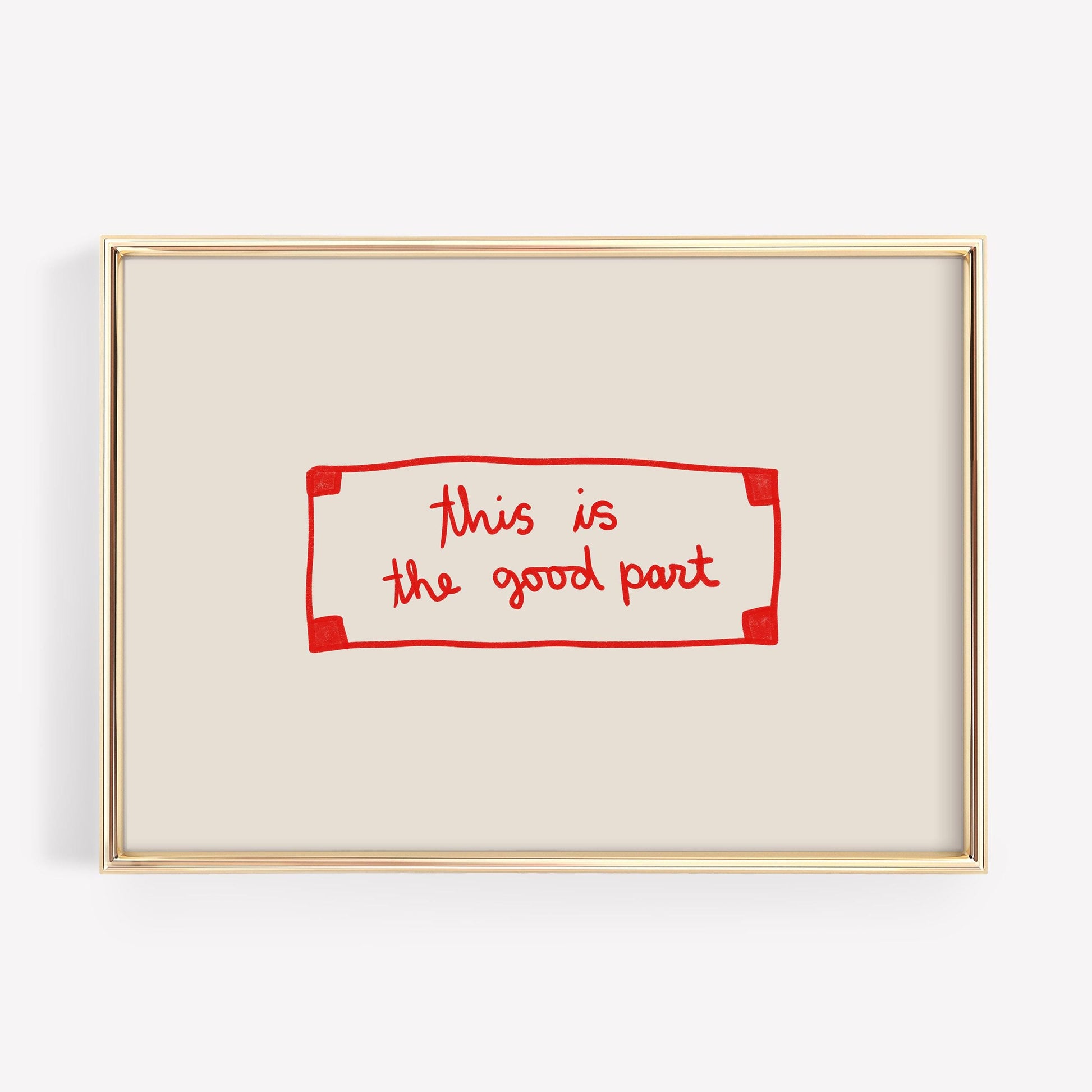 This red wall art print features the inspiring phrase “This is the good part” rendered in modern hand-drawn typography, making it a perfect motivational quote art piece. This art print adds personality and warmth to any space, creating an uplifting atmosphere that enhances your home decor. Its minimalist style brings a subtle yet bold statement to your living environment.