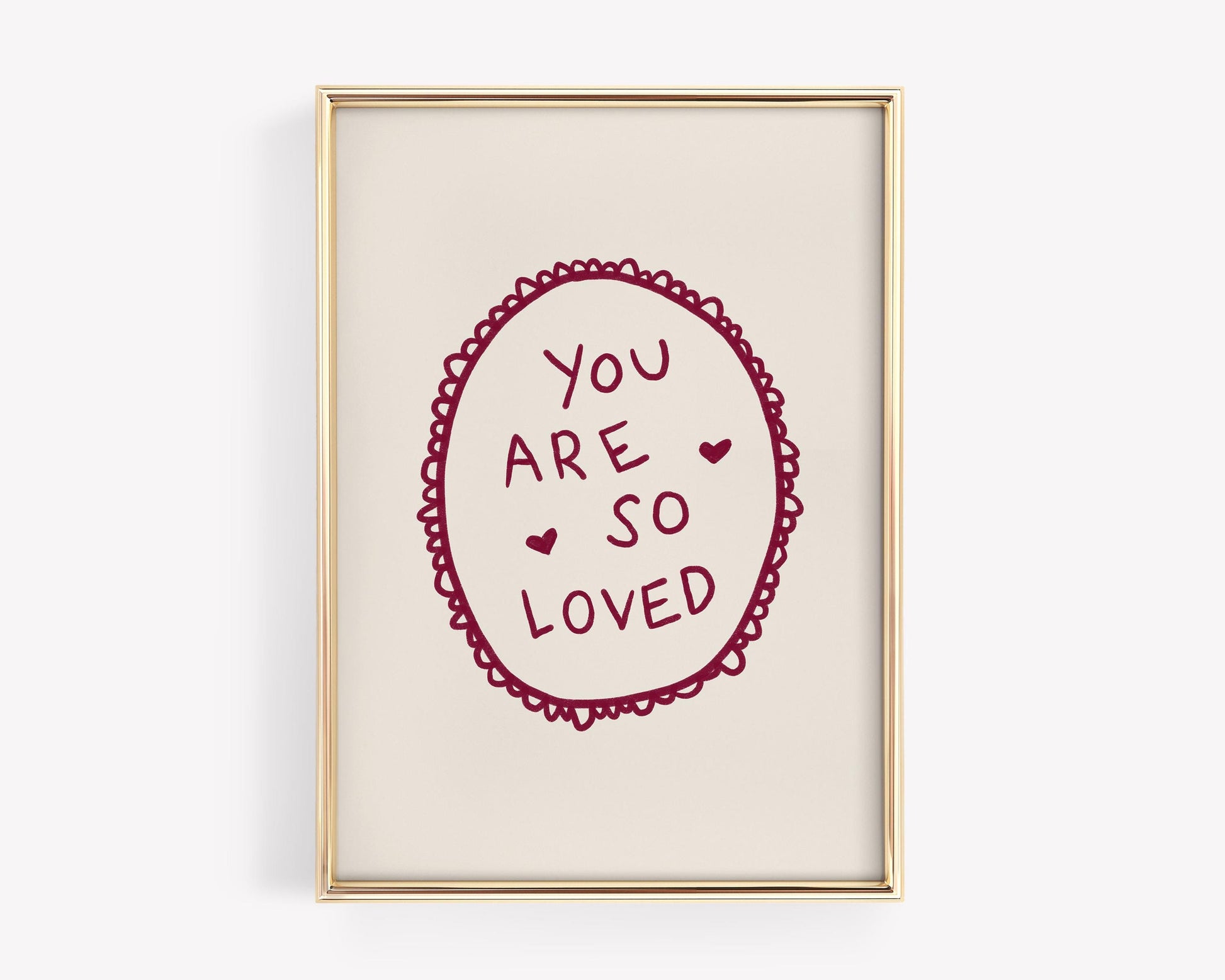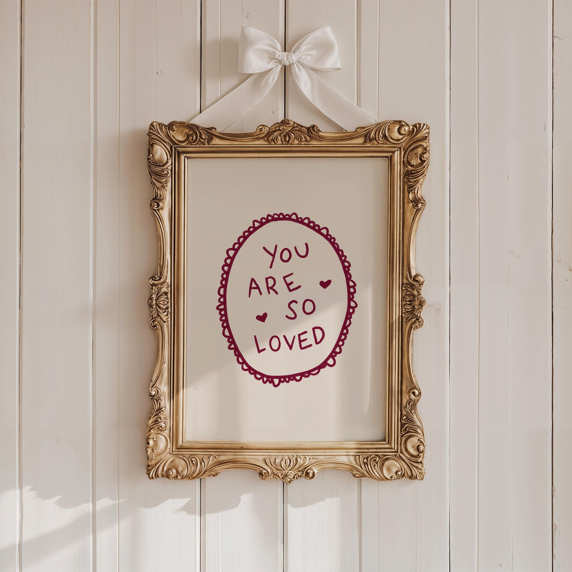 A minimalist burgundy typography art print framed by a hand-drawn lace-style oval and featuring the phrase “You are so loved.” Ideal for a nursery, bedroom, or quiet corner, it adds a gentle, reassuring touch.